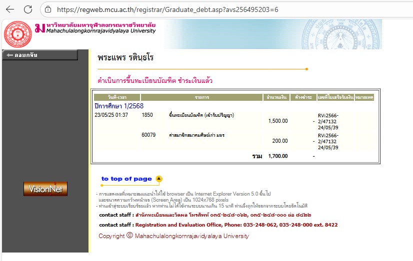 | สถานะเข้าพิธีประสาทปริญญา : บรรพชิต | ระดับ : ปริญญาตรี | สังกัดคณะ: คณะพุทธศาสตร์ | สาขาวิชา: พระพุทธศาสนา |