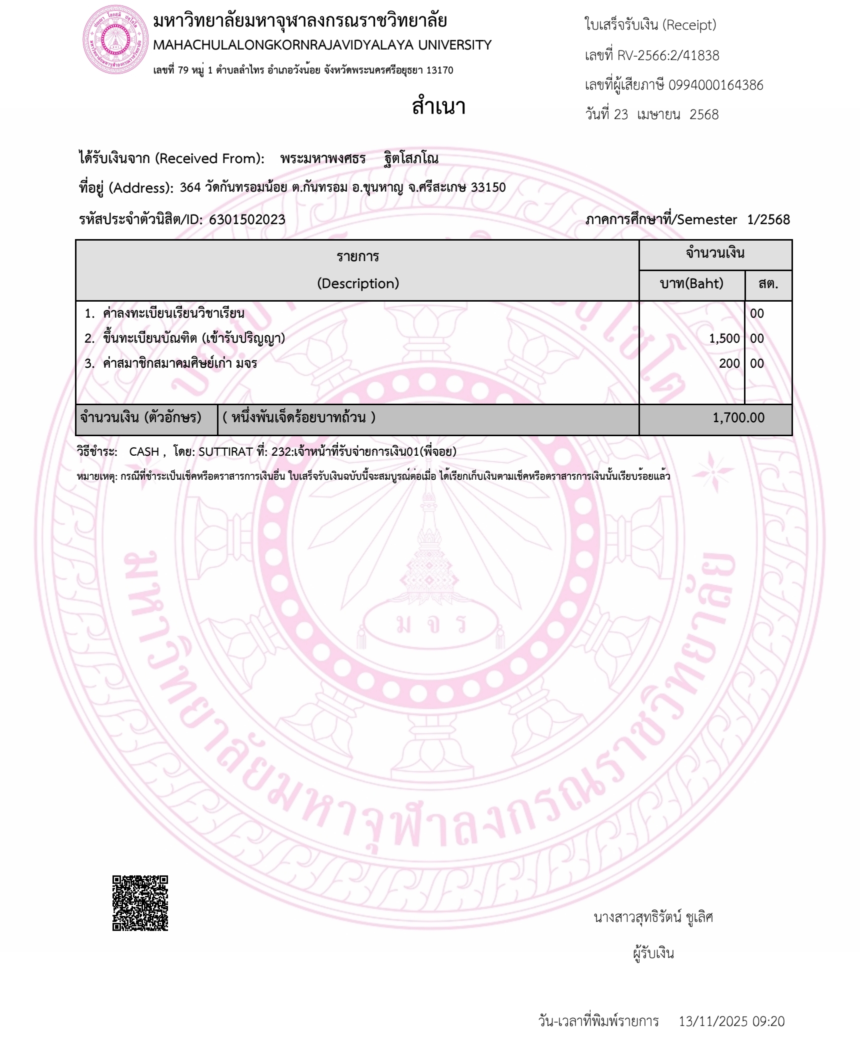 | รหัสนิสิต : 6301502023 | ชื่อ : พระมหาพงศธร | ฉายา: ฐิตโสภโณ | นามสกุล: ศรีมงคล |