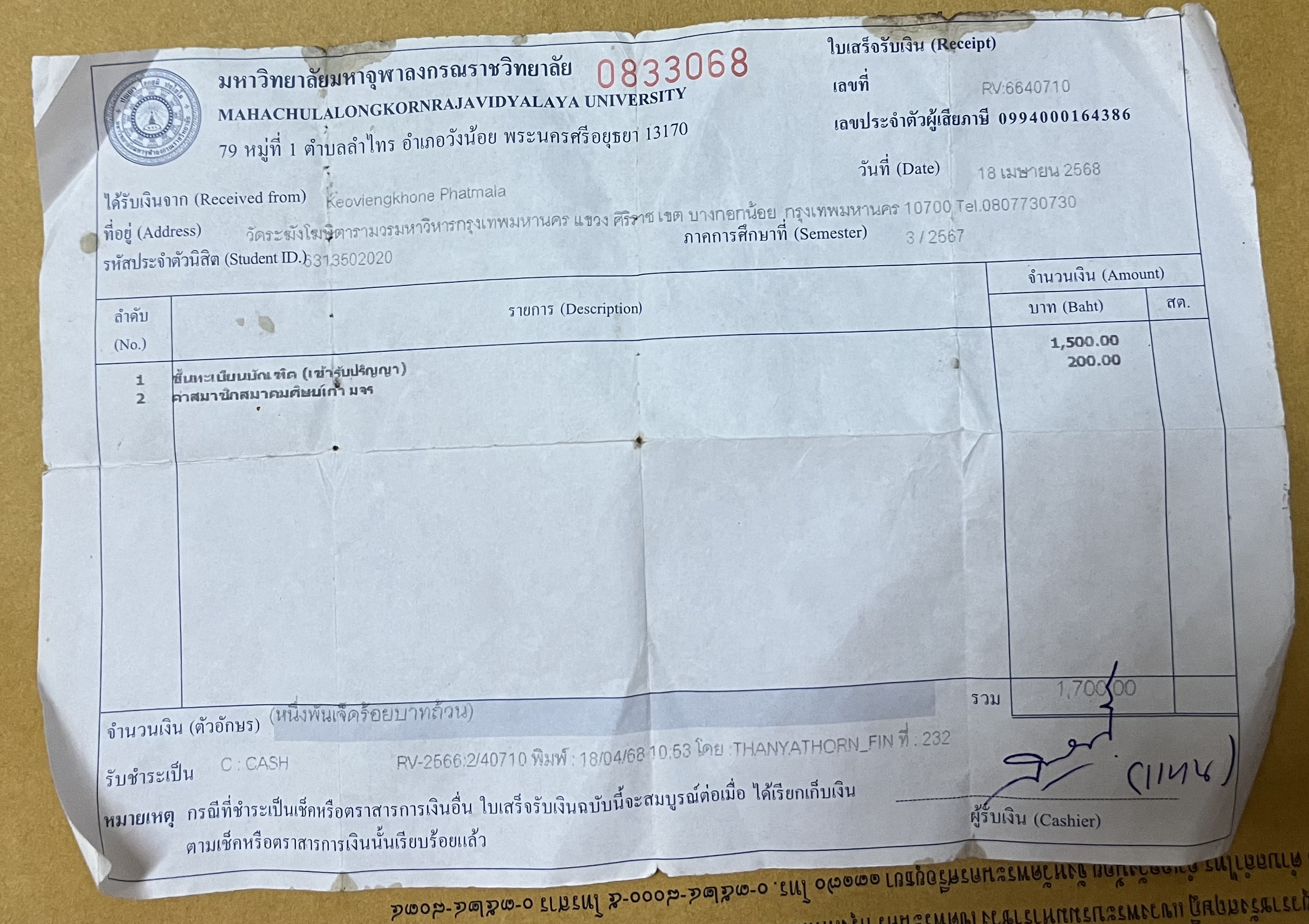 ใบเสร็จรับเงิน/เอกสารยืนยันการชำระเงิน(แนบเอกสาร)