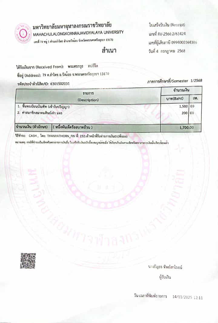 | รหัสนิสิต : 6301502031 | ชื่อ : พระศราวุธ | ฉายา: ตปสีโล | นามสกุล: จิตต์สวัสดิ์ |