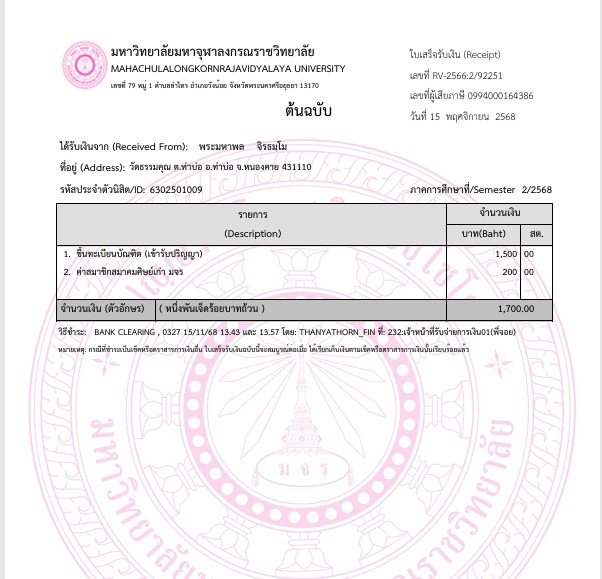 | สถานะเข้าพิธีประสาทปริญญา : บรรพชิต | ระดับ : ปริญญาตรี | สังกัดคณะ: คณะพุทธศาสตร์ | สาขาวิชา: พระพุทธศาสนา |