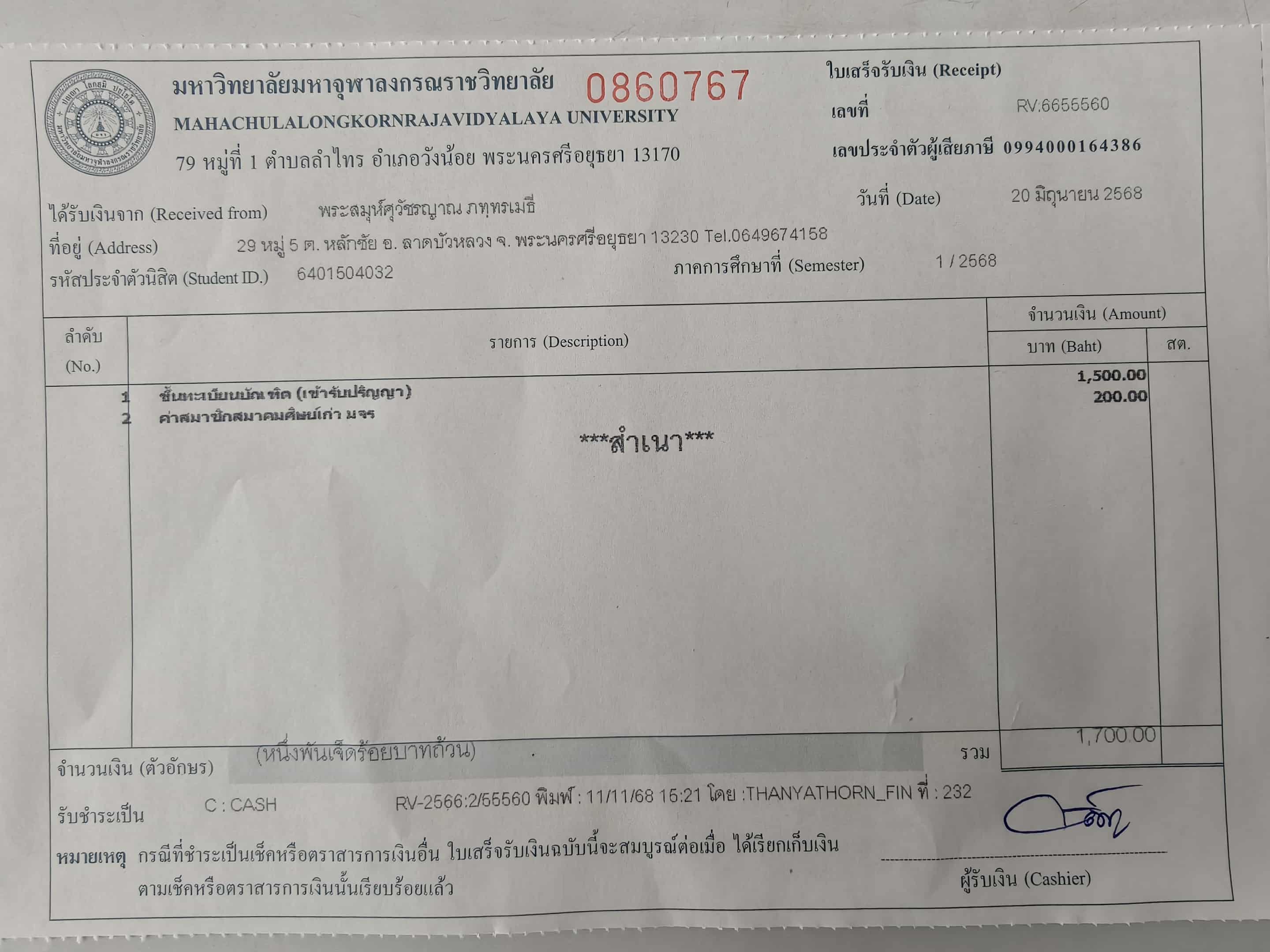 | สถานะเข้าพิธีประสาทปริญญา : บรรพชิต | ระดับ : ปริญญาตรี | สังกัดคณะ: คณะสังคมศาสตร์ | สาขาวิชา: รัฐประศาสนศาสตรบัณฑิต |
