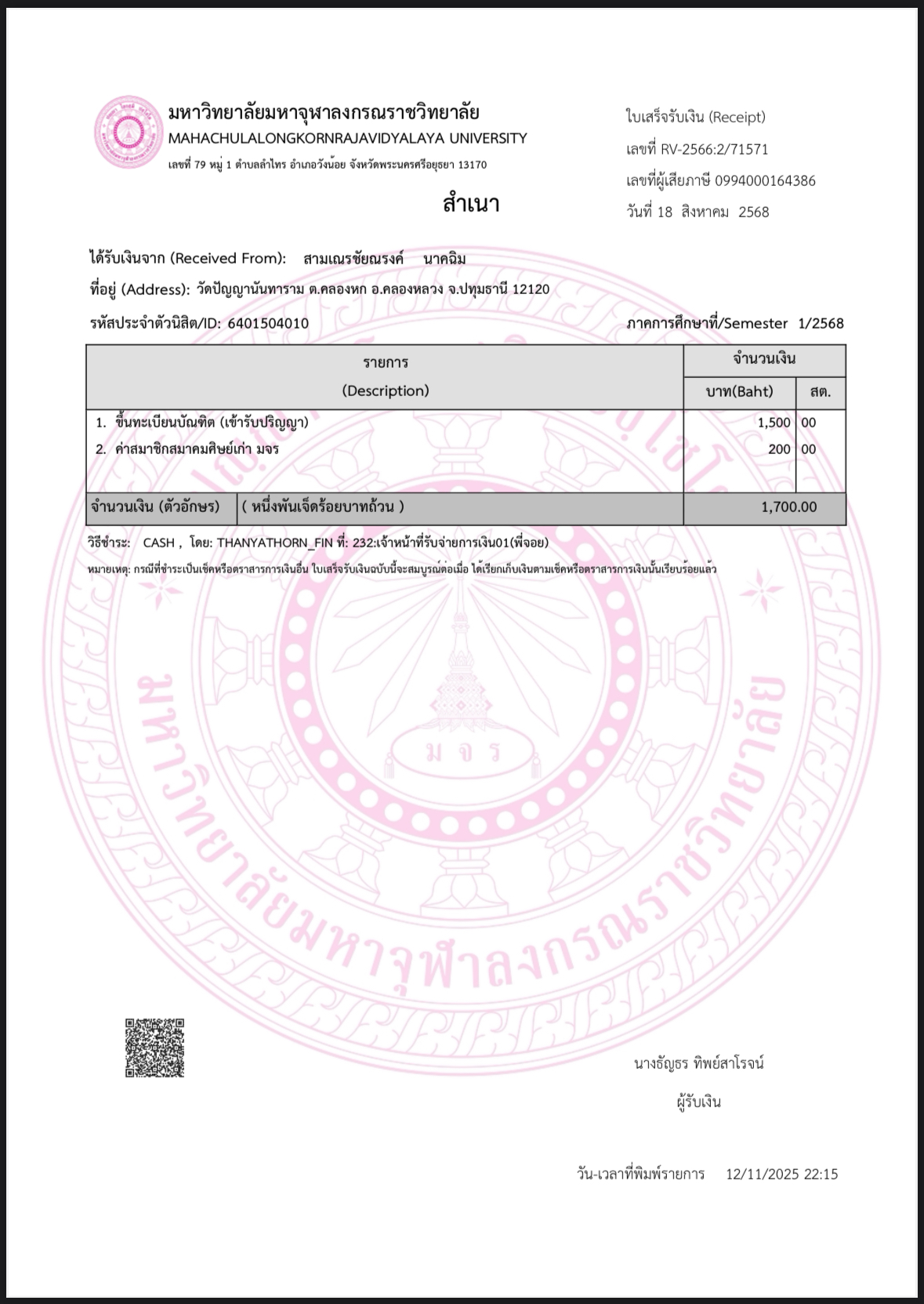 | สถานะเข้าพิธีประสาทปริญญา : บรรพชิต | ระดับ : ปริญญาตรี | สังกัดคณะ: คณะสังคมศาสตร์ | สาขาวิชา: รัฐศาสตรบัณฑิต |