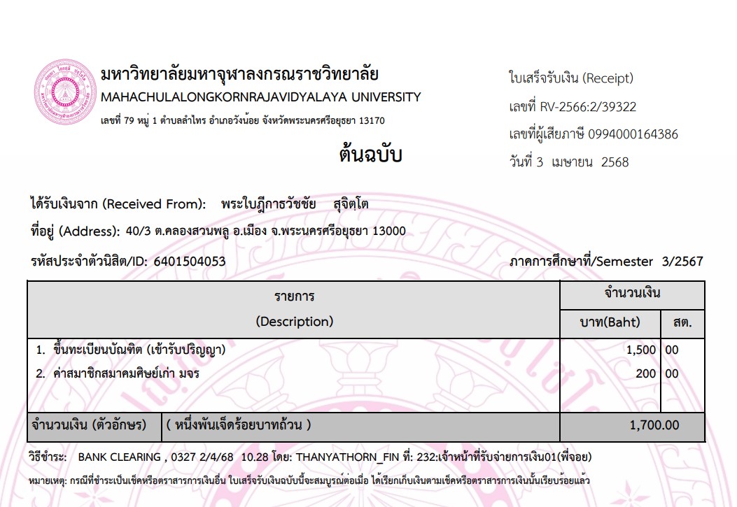 | สถานะเข้าพิธีประสาทปริญญา : บรรพชิต | ระดับ : ปริญญาตรี | สังกัดคณะ: คณะสังคมศาสตร์ | สาขาวิชา: การจัดการเชิงพุทธ |