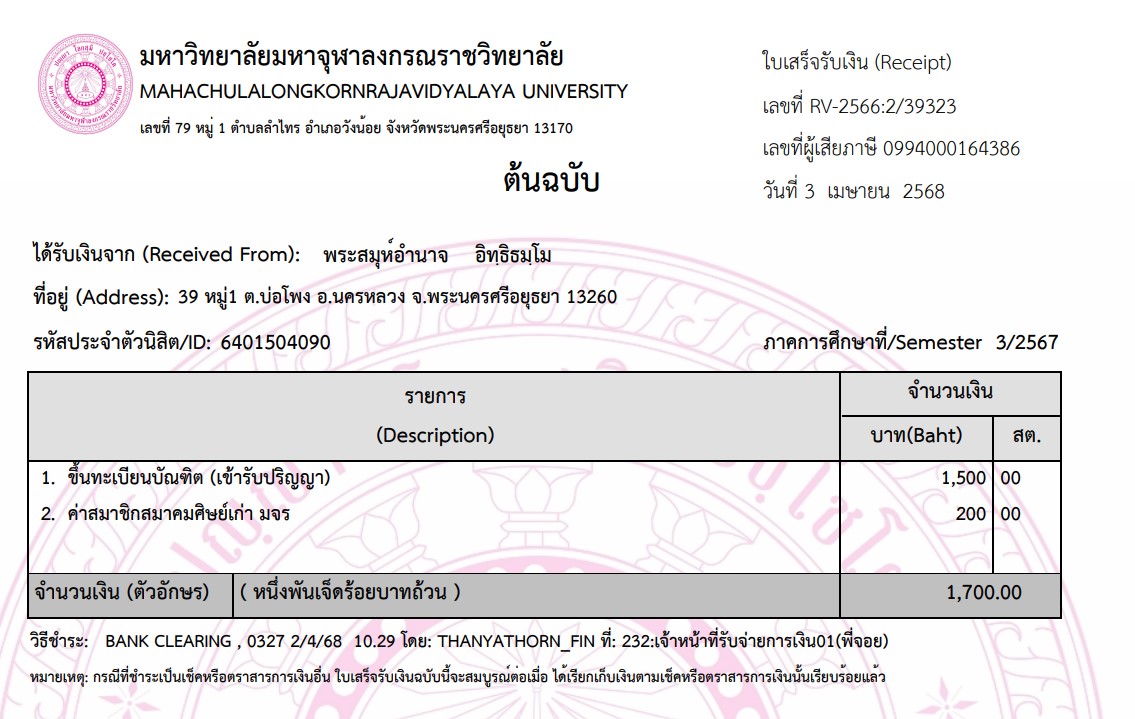 | สถานะเข้าพิธีประสาทปริญญา : บรรพชิต | ระดับ : ปริญญาตรี | สังกัดคณะ: คณะสังคมศาสตร์ | สาขาวิชา: การจัดการเชิงพุทธ |