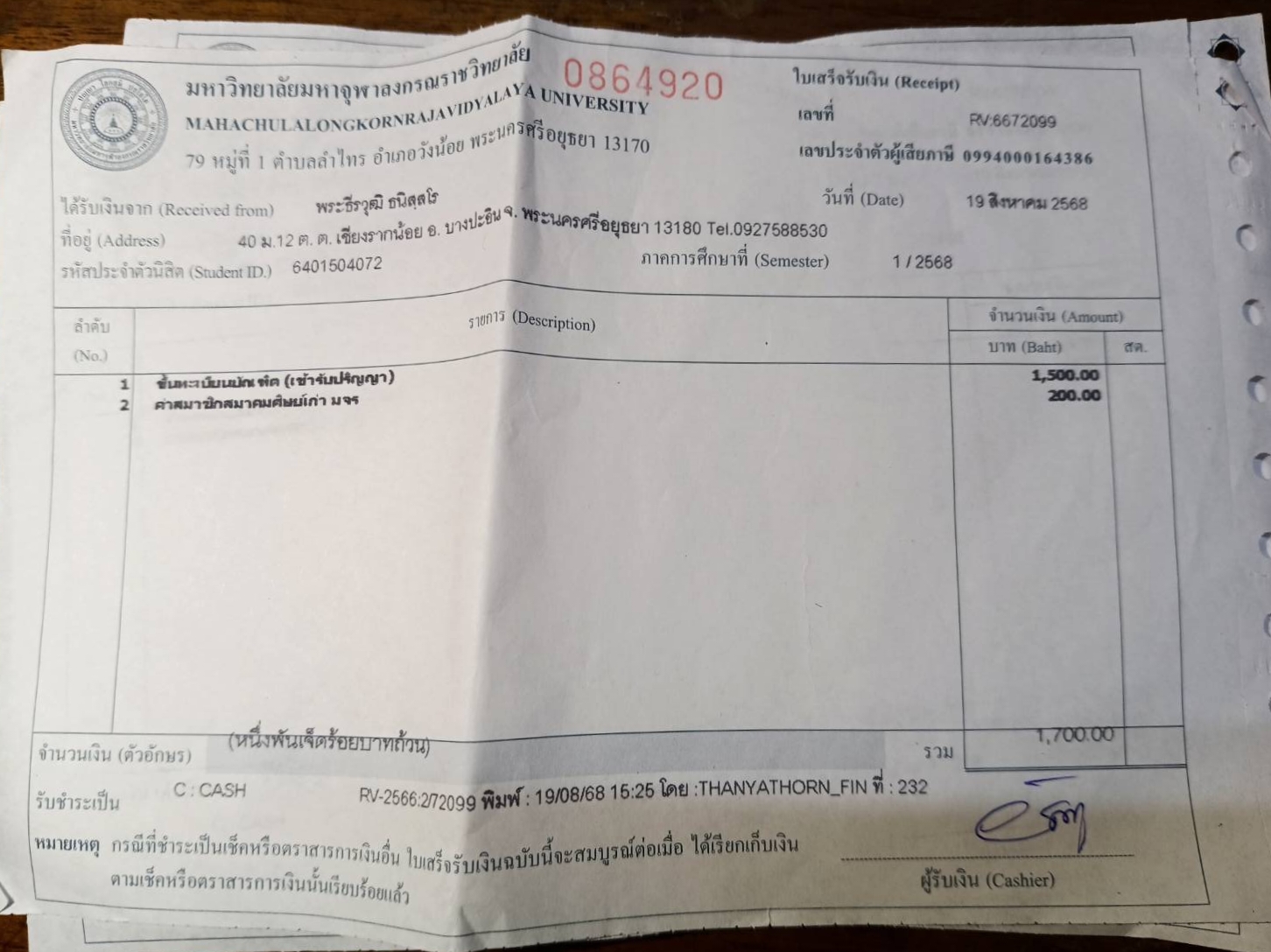 | สถานะเข้าพิธีประสาทปริญญา : บรรพชิต | ระดับ : ปริญญาตรี | สังกัดคณะ: คณะสังคมศาสตร์ | สาขาวิชา: การจัดการเชิงพุทธ |