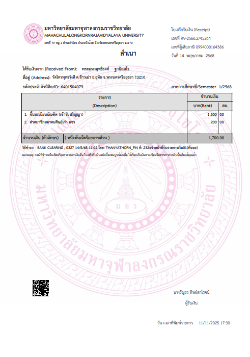 สถานะเข้าพิธีประสาทปริญญา : บรรพชิต ระดับ : ปริญญาตรี สังกัดคณะ: คณะสังคมศาสตร์ สาขาวิชา: การจัดการเชิงพุทธ