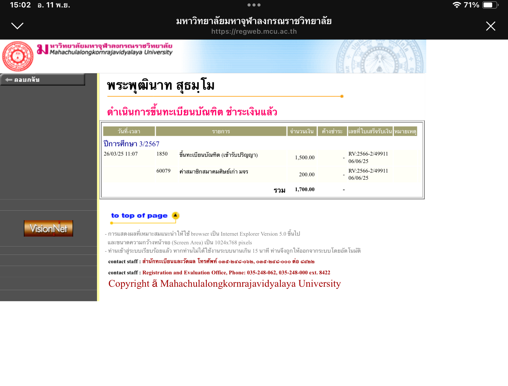 | สถานะเข้าพิธีประสาทปริญญา : บรรพชิต | ระดับ : ปริญญาตรี | สังกัดคณะ: คณะสังคมศาสตร์ | สาขาวิชา: การจัดการเชิงพุทธ |