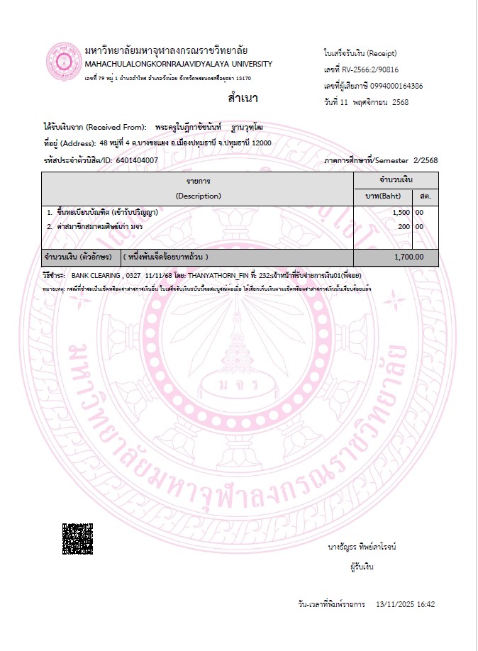 | สถานะเข้าพิธีประสาทปริญญา : บรรพชิต | ระดับ : ปริญญาตรี | สังกัดคณะ: คณะสังคมศาสตร์ | สาขาวิชา: การจัดการเชิงพุทธ |