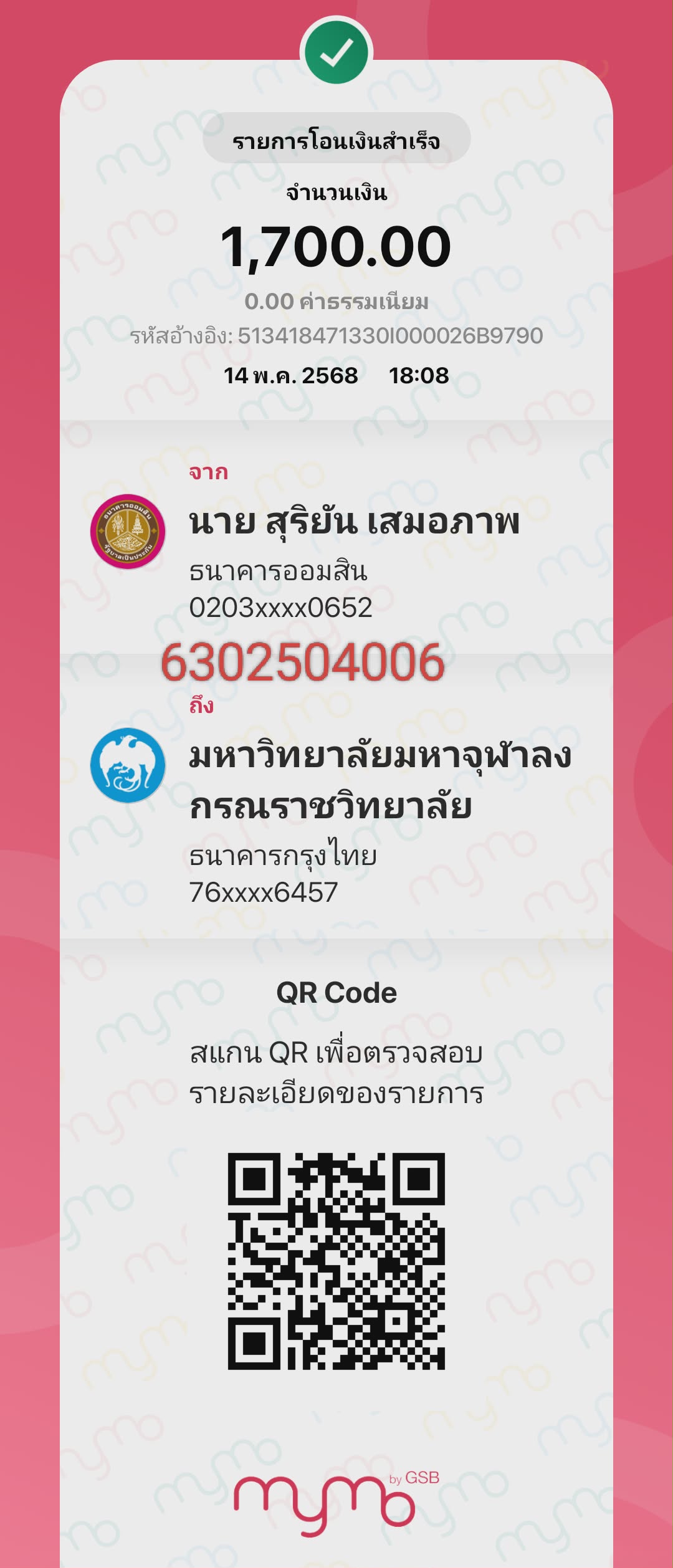 | รหัสนิสิต : 6302504006 | ชื่อ : พระสุริยัน | ฉายา: สนฺตมโน | นามสกุล: เสมอภาพ |