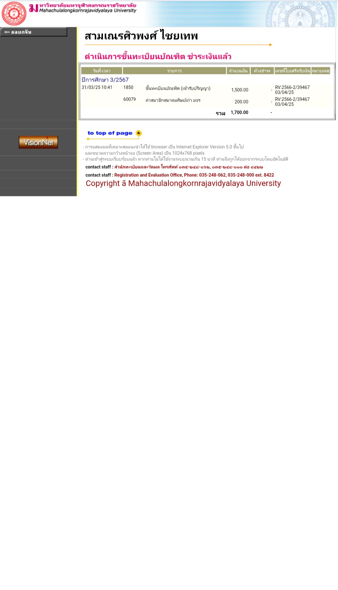 | สถานะเข้าพิธีประสาทปริญญา : บรรพชิต | ระดับ : ปริญญาตรี | สังกัดคณะ: คณะสังคมศาสตร์ | สาขาวิชา: รัฐศาสตรบัณฑิต |