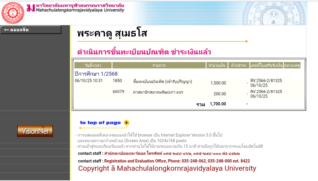 | สถานะเข้าพิธีประสาทปริญญา : บรรพชิต | ระดับ : ปริญญาตรี | สังกัดคณะ: คณะสังคมศาสตร์ | สาขาวิชา: รัฐศาสตรบัณฑิต |