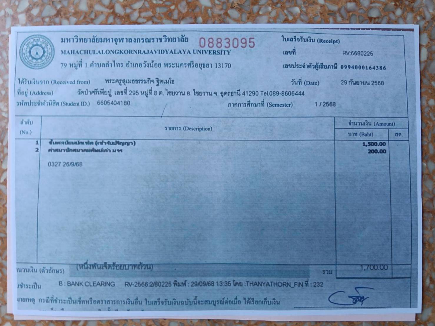 | สถานะเข้าพิธีประสาทปริญญา : บรรพชิต | ระดับ : ปริญญาตรี | สังกัดคณะ: คณะสังคมศาสตร์ | สาขาวิชา: นิติศาสตรบัณฑิต |