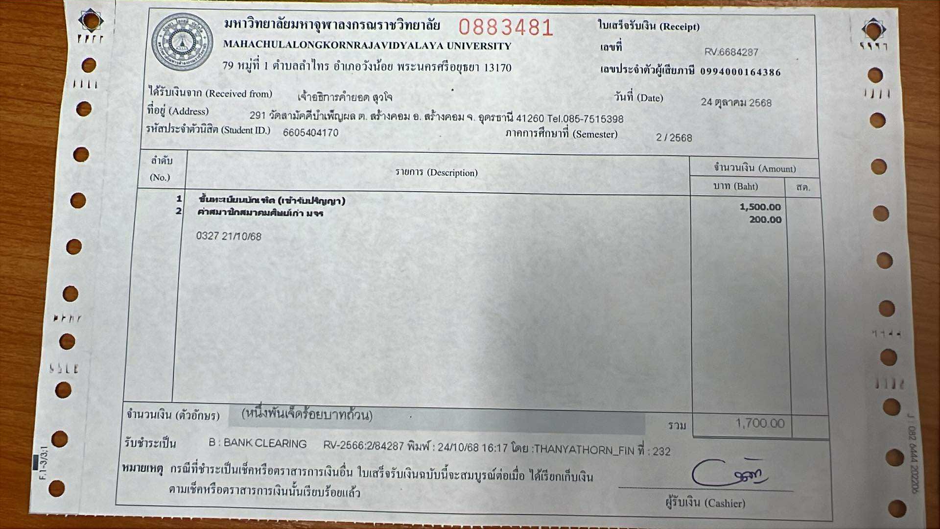 | สถานะเข้าพิธีประสาทปริญญา : บรรพชิต | ระดับ : ปริญญาตรี | สังกัดคณะ: คณะสังคมศาสตร์ | สาขาวิชา: นิติศาสตรบัณฑิต |