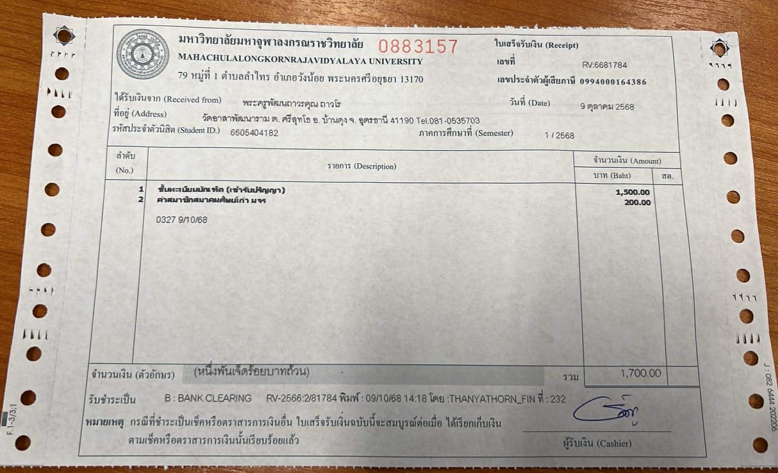ใบเสร็จรับเงิน/เอกสารยืนยันการชำระเงิน(แนบเอกสาร)