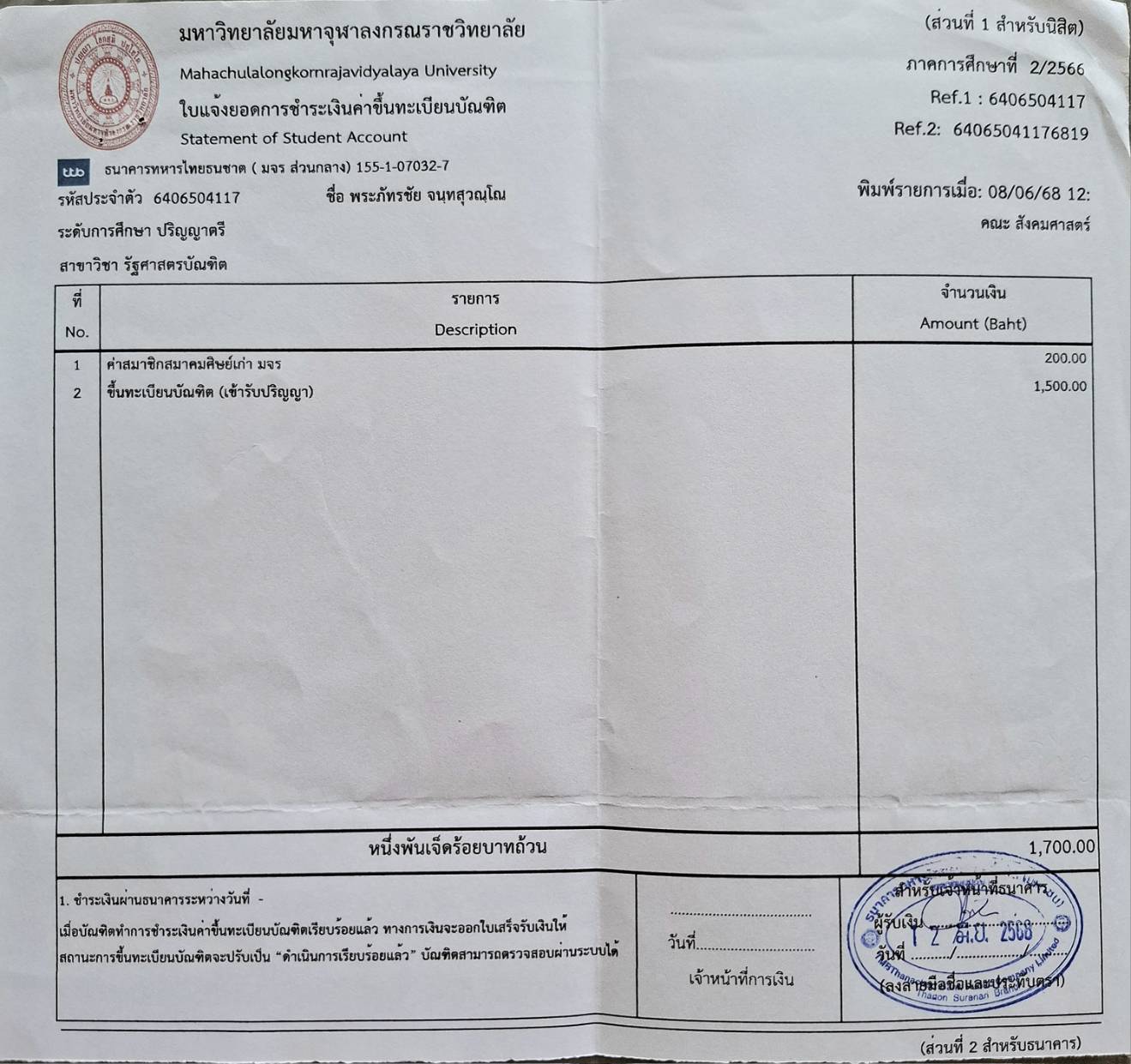 | สถานะเข้าพิธีประสาทปริญญา : บรรพชิต | ระดับ : ปริญญาตรี | สังกัดคณะ: คณะสังคมศาสตร์ | สาขาวิชา: รัฐศาสตรบัณฑิต |