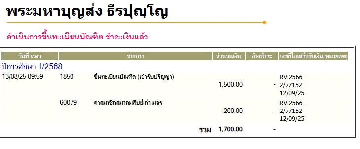 | สถานะเข้าพิธีประสาทปริญญา : บรรพชิต | ระดับ : ปริญญาตรี | สังกัดคณะ: คณะสังคมศาสตร์ | สาขาวิชา: การจัดการเชิงพุทธ |